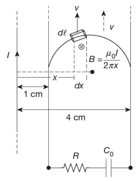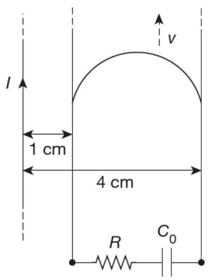Question: A long straight wire carries a current, ampere. A semi-circular conducting rod is placed beside it on two conducting parallel rails of negligible resistance. Both the rails are parallel to the wire. The wire, the rod and the rails lie in the same horizontal plane, as shown in the figure. Two ends of the semi-circular rod are at distances 1 cm and 4 cm from the wire. At time