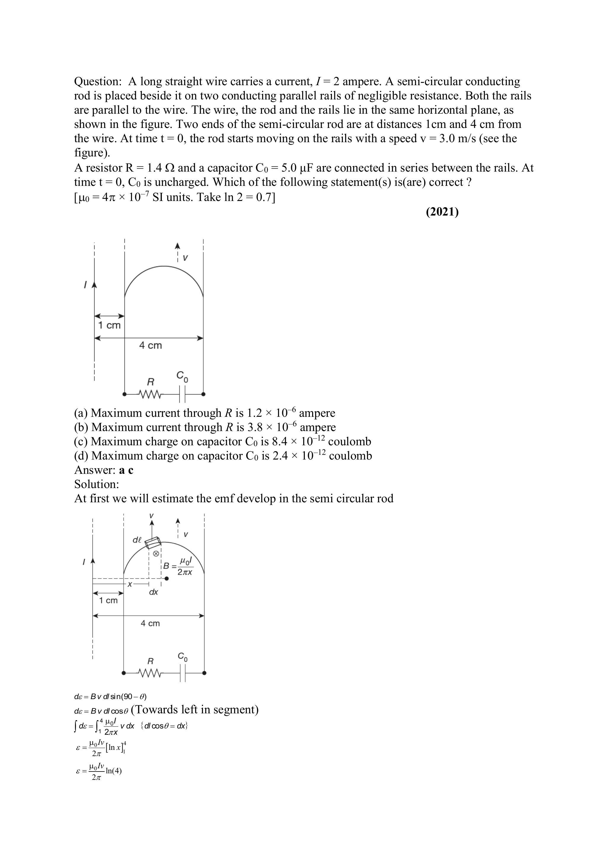 Question: A long straight wire carries a current, ampere. A semi-circular conducting rod is placed beside it on two conducting parallel rails of negligible resistance. Both the rails are parallel to the wire. The wire, the rod and the rails lie in the same horizontal plane, as shown in the figure. Two ends of the semi-circular rod are at distances 1 cm and 4 cm from the wire. At time